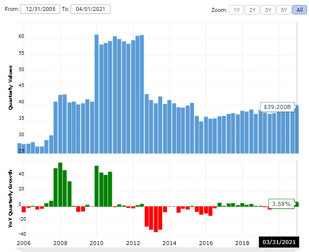2021년 3월 1분기가 끝나는 시점에 총 부채 = 39.200B = 약 392억달러 = 약 39조원