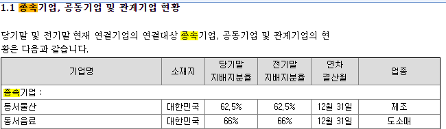 동서 사업보고서에서 '종속'을 검색해봅니다.