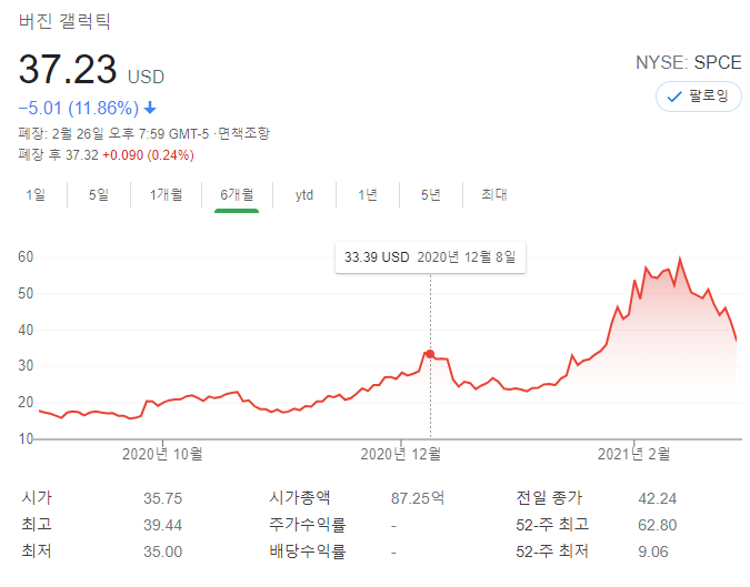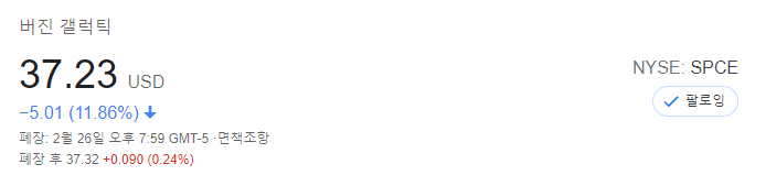 2021년 2월 26일에 발사 일정 발표 이후 (2021년 5월 발사예정) 버진 갤럭틱(virgin galactic holdings: spce)주가가 하루 사이에 11.9% 떨어졌다.