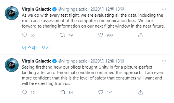 아무리 안전문제가 없었다고 하더라도, 계획된 우주비행은 실패한 상황에서, 회사가 너무 좋은 쪽으로만 말하는 것 같다는 느낌을 받았으나... 회사가 외부에 발표할 때는 원래 다 이런 것이겠거니 했다. 이걸 보고 사람들은 원인 해결 및 다음 발사 일정이 가까운 미래에 있을 것이라고 기대했던 것 같다. 다음 발사가 예상보다 늦은 5월로 발표되고, 승객 태우고 우주로 가는 첫 비행은 기존 2021년에서 2022년 초로 미뤄진다는 예상이 나오자 주가가 크게 떨어진 것이다.